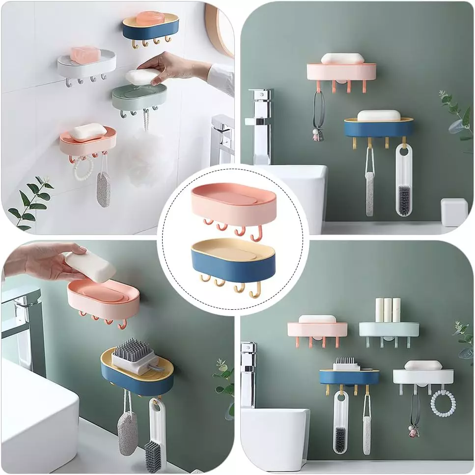 Made of PP material, this soap dish is durable and practical. This creative shelf can make your bathroom tidy and clean. Produced to store soap and the hooks design will provide you with more space to hang small items, washcloths, hair bands, loofah and much more.